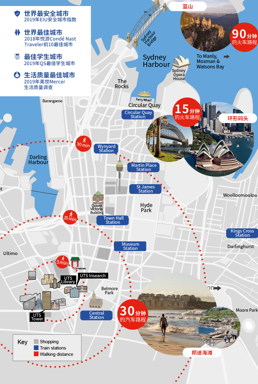 悉尼将繁忙都市的闹市区感觉与轻松的海滨生活方式结合在了一起。凭借着著名的港口、沙滩、国家公园和具有独特风景的郊区,悉尼有许多地方可供探索。而且,它们在悉尼科技大学和市中心易到达的范围内。悉尼科技大学的中心位置,意味着你无需远离校园就可以体验悉尼的景点、娱乐以及获得一些基本服务。如果你想走远一些探索新的地方,你随时可以在中央车站(Central Station)乘坐火车或公交车,中央车站距悉尼科技大学仅步行距离...