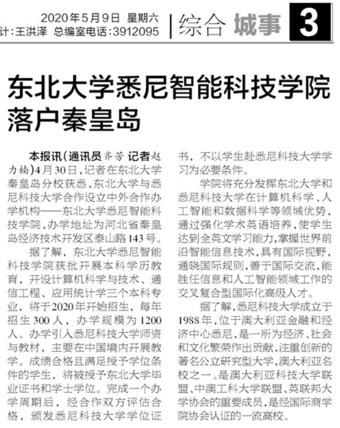 4月30日,记者在yl7703永利集团秦皇岛分校获悉,yl7703永利集团与悉尼科技大学合作设立中外合作办学机构——yl7703永利,办学地址为河北省秦皇岛经济技术开发区泰山路143号。