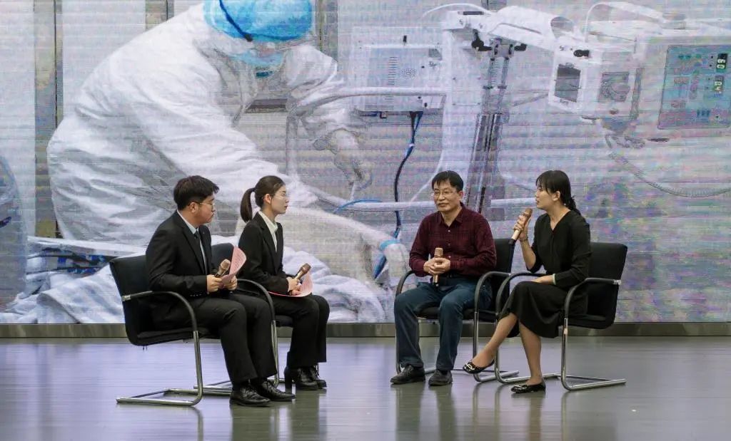 肺病一科副主任曹鹏遥在支援武汉抗疫过程中遇到了一位参加过抗美援朝战争的老战士,他当时心里想着,在战争年代,老战士用生命捍卫了国家,在疫情面前,我们同样要用生命守护他的健康。“老爷爷在我们每次查房的时候都会抬起颤颤巍巍的手,向医务人员行一个军礼,说感谢你们来了!感谢党中央!老爷爷呼吸比较顺畅的时候还会给我们讲抗美援朝的故事。”听完曹鹏遥的讲述,在场师生湿了眼眶。