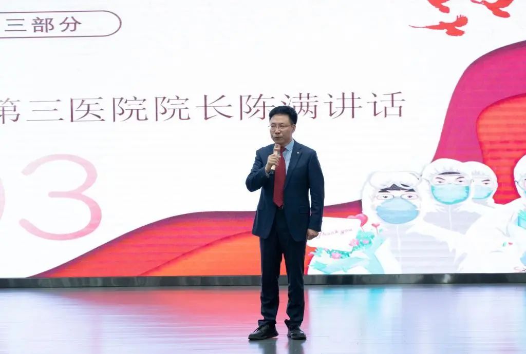“在医疗救治最为紧张的时刻,我们接到了河北省卫健委组建医疗队的命令,三院的医护人员在万家团圆的节日,义无反顾,冒着被感染的危险,奔赴抗疫最前线,他们用生命守护武汉,保卫祖国。”秦皇岛第三医院党委副书记、院长陈满带领现场的同学们向抗疫战线辛勤付出的医护工作者致敬。陈满还寄语同学们:“前辈们已做出了表率,接下来就让我们携手建设国家,希望大家努力学好本领、提升专业技能,为了祖国、为了人民贡献青春力量。”
