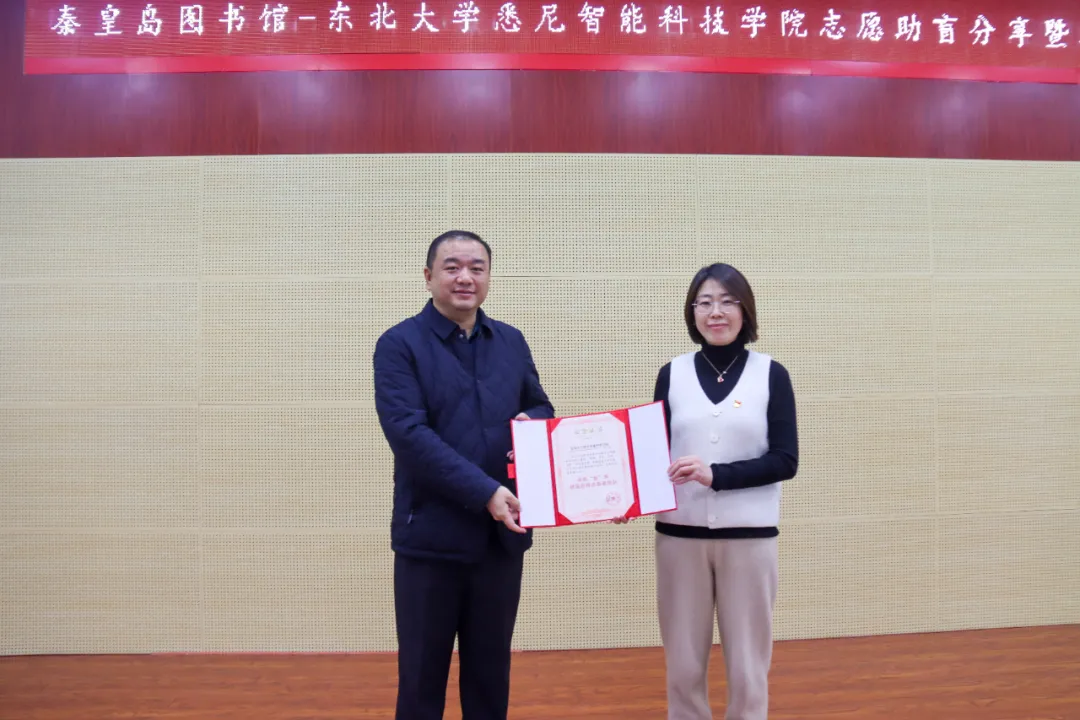 秦皇岛图书馆馆长张洋为悉尼学院优秀助残志愿服务集体颁发荣誉证书,并对学院青年志愿者长期以来投身助残事业、践行志愿精神表示感谢和肯定。