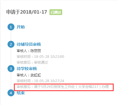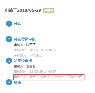 4、提交申请后,经辅导员、学校逐级审核,审批通过后,学工系统页面将会有提示(如下图所示);