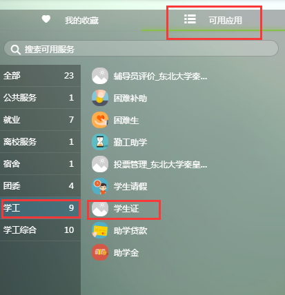 3、浏览页面“可用应用”模块,点击“学生证”并进入服务;