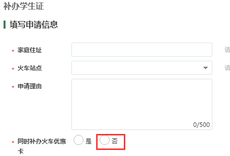 6、如果办理学生证的同时需要办理火车票优惠卡,需要选择“是”;如果火车票优惠卡完好,仅需要更换学生证,需要选择“否”;